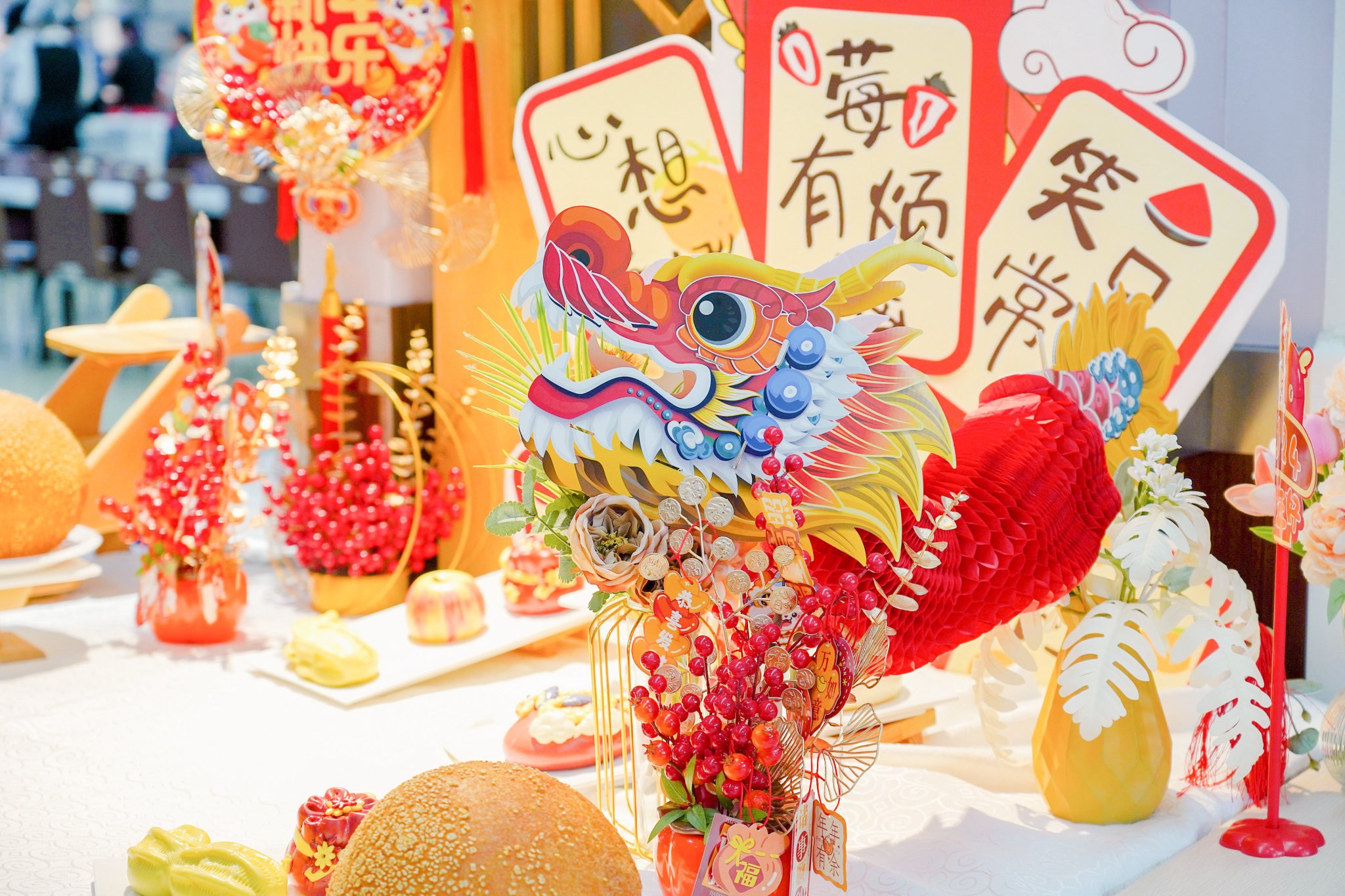 龙年新程,应有鸿运当头,且又适逢开工首周迎元宵,HB火博多家项目餐厅以祥龙、醒狮等经典“新年ip”为主题,延续新年的余韵,让琳琅满目的喜气由眼而心,为用餐顾客红火开年。